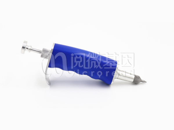 打孔器外形设计参考移液器外形,人性化设计,减少长时间握持导致对手掌的损伤;闲暇之余可将打孔器置于移液枪架上,防止滚落摔坏,减少意外损耗,有助于延长打孔器使用寿命。