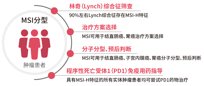 MSI作为全球首个泛癌种分子标志物,现在被NCCN、ASCO、CSCO、《中国结直肠癌诊疗规范》等诸多国内外权威指南联合推荐检测,可用于林奇综合征的筛查、癌症的分子分型、预后判断、预测化疗疗效和所有实体瘤患者的PD-1/PD-L1免疫用药指导。截止现在,MSI已经被写入十多种癌种的NCCN指南中。