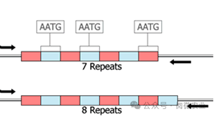 简单重复序列(Simple Sequence Repeat,SSR,也叫微卫星DNA(MS)或短串联重复序列(STR)是一类广泛存在于真核生物基因组中的DNA串联重复序列,其核心序列一般为2-6bp,重复次数多数为5-30次。 多数STR基因座具有多态性,主要源于核心序列重复次数的个体差异,这种差异在基因传递的过程中一般遵循孟德尔共显性遗传规律。如下展示为一个简单的 4 核心序列(AATG) 在不同个体内分别为 7、8次重复的情况: