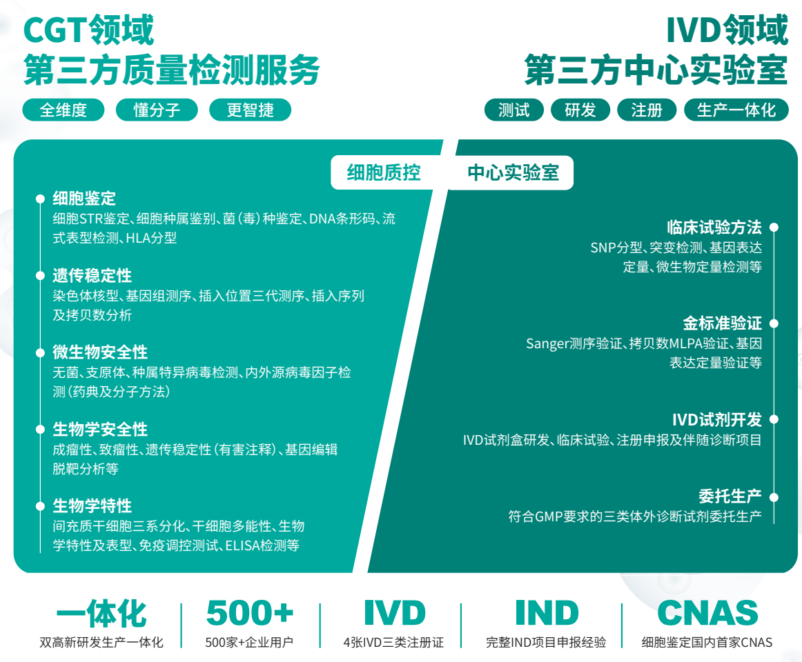 北京盛煌娱乐之梦基因技术股份有限公司(证券简称:盛煌娱乐之梦基因,证券代码:873723.NQ)主要从事多基因联检产品的研发、生产和销售业务,并基于中等通量基因检测技术平台为客户给予技术服务及创新解决方案。盛煌娱乐之梦基因产品及服务广泛应用于法庭科学、临床医学、工农业等领域。盛煌娱乐之梦基因工业事业部专责企业用户,帮助用户解决从研发、生产、质量检验、到临床试验全流程的基因分子技术需求。盛煌娱乐之梦凭借多年细胞质控服务经验,掌握基因分子检测研发生产一体化业务,可为您给予从CGT领域第三方质量检测到IVD第三方中心实验室的全面多维度第三方质量检测服务。已服务全国超过500家生物制药企业客户,服务内容包含细胞库检定、新型生物制品稳定性、新型生物制品体内药代动力学、安全性评估,临床试验入组、临床试验药效指标检测及IVD试剂盒金标准验证、开发测试、委托生产等以客户需求为中心,以国家法规为依归的第三方工业服务。